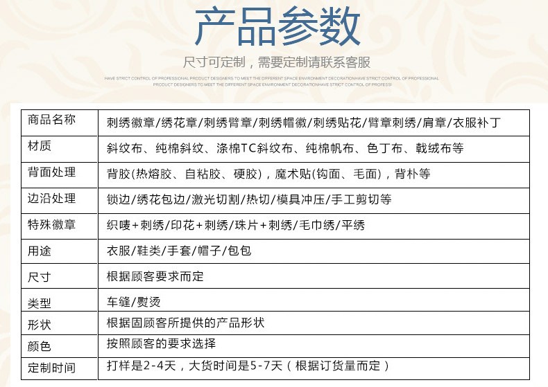 产品种类:3D立体绣、贴布绣、绣花章、毛巾绣/勾冷绣、特种混合绣
